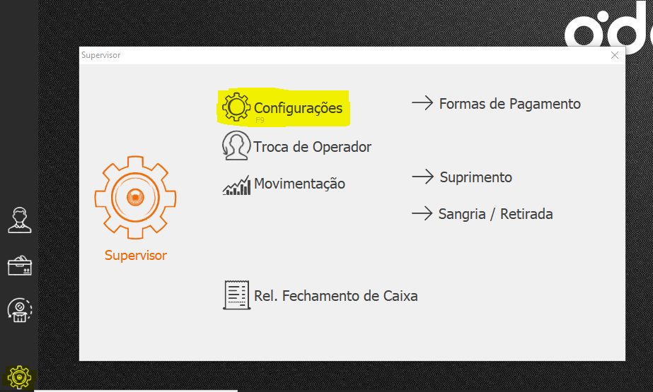 GDOOR Gerencial> Clique no ícone de Engrenagem> Configurações