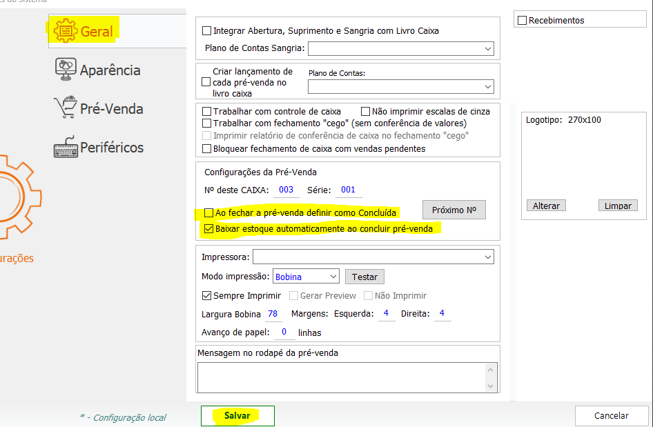 Geral> Marque as caixas “Ao fechar a pré-venda definir como Concluída” e “Baixar estoque automaticamente ao concluir pré-venda”> Salvar