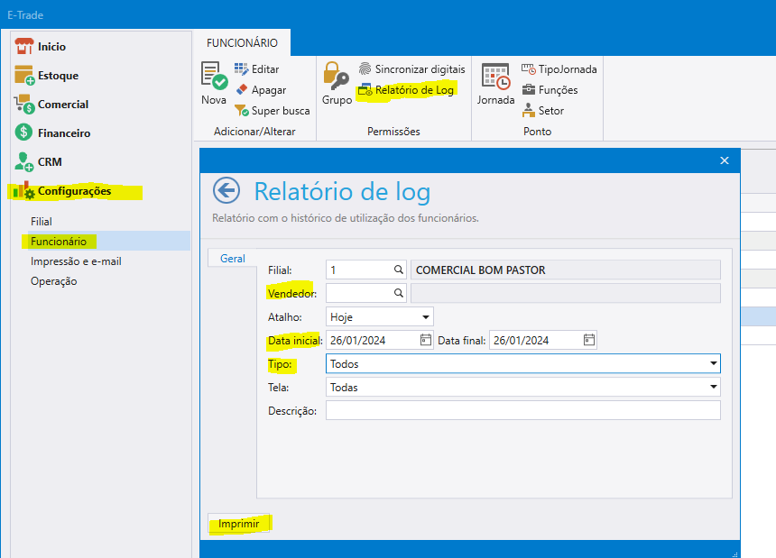 Relatório de logs – E-trade Por Fransini OliveiraEm E-TRADEPostou janeiro 26, 20240 comentário(s) E-trade> Configurações> Funcionário> Relatório de Log> Selecione a data, vendedor e tipos de log> Imprimir.